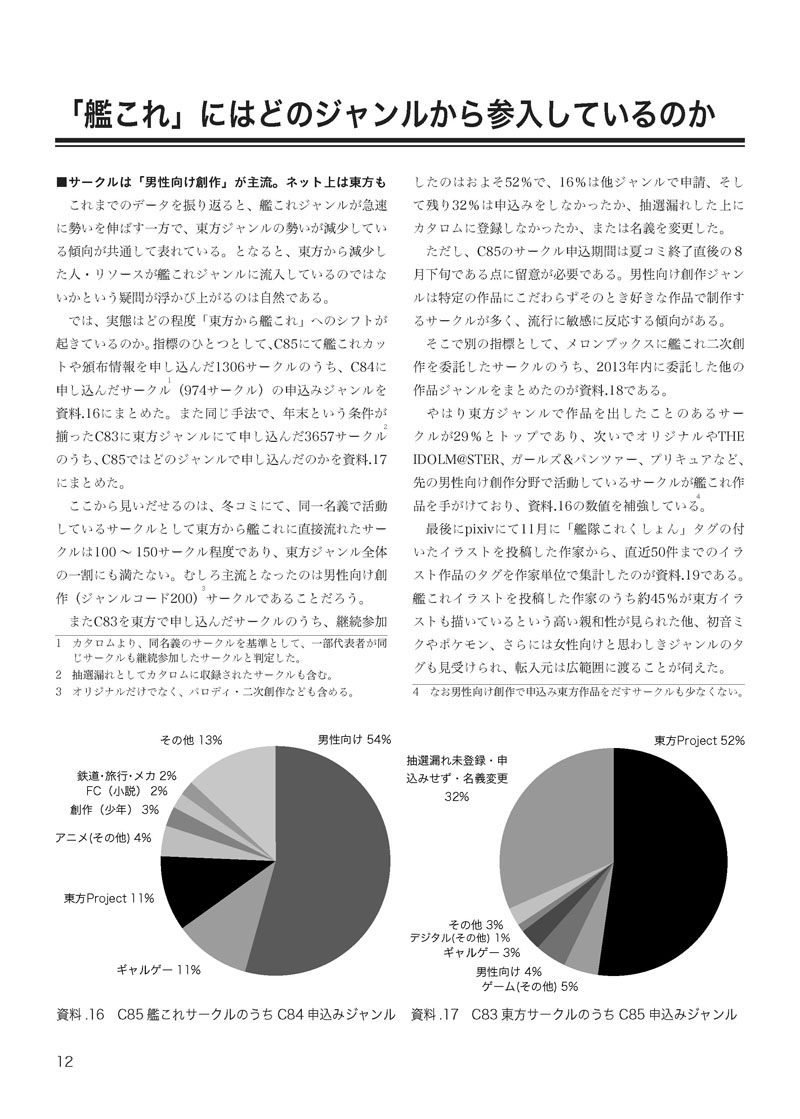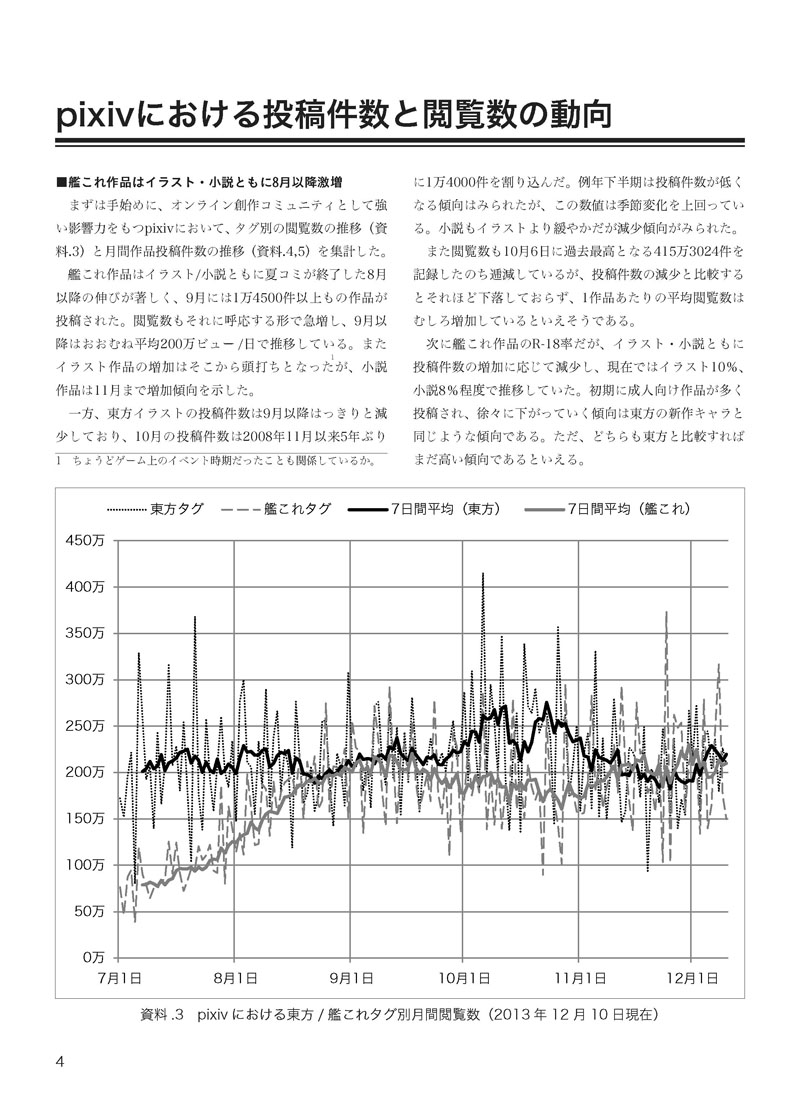 - 割と読んで字のごとくですが、pixivやニコニコ動画、コミケットなどにおける東方Projectと艦隊これくしょん二次創作の動向について、数値データを元に評論した本です。